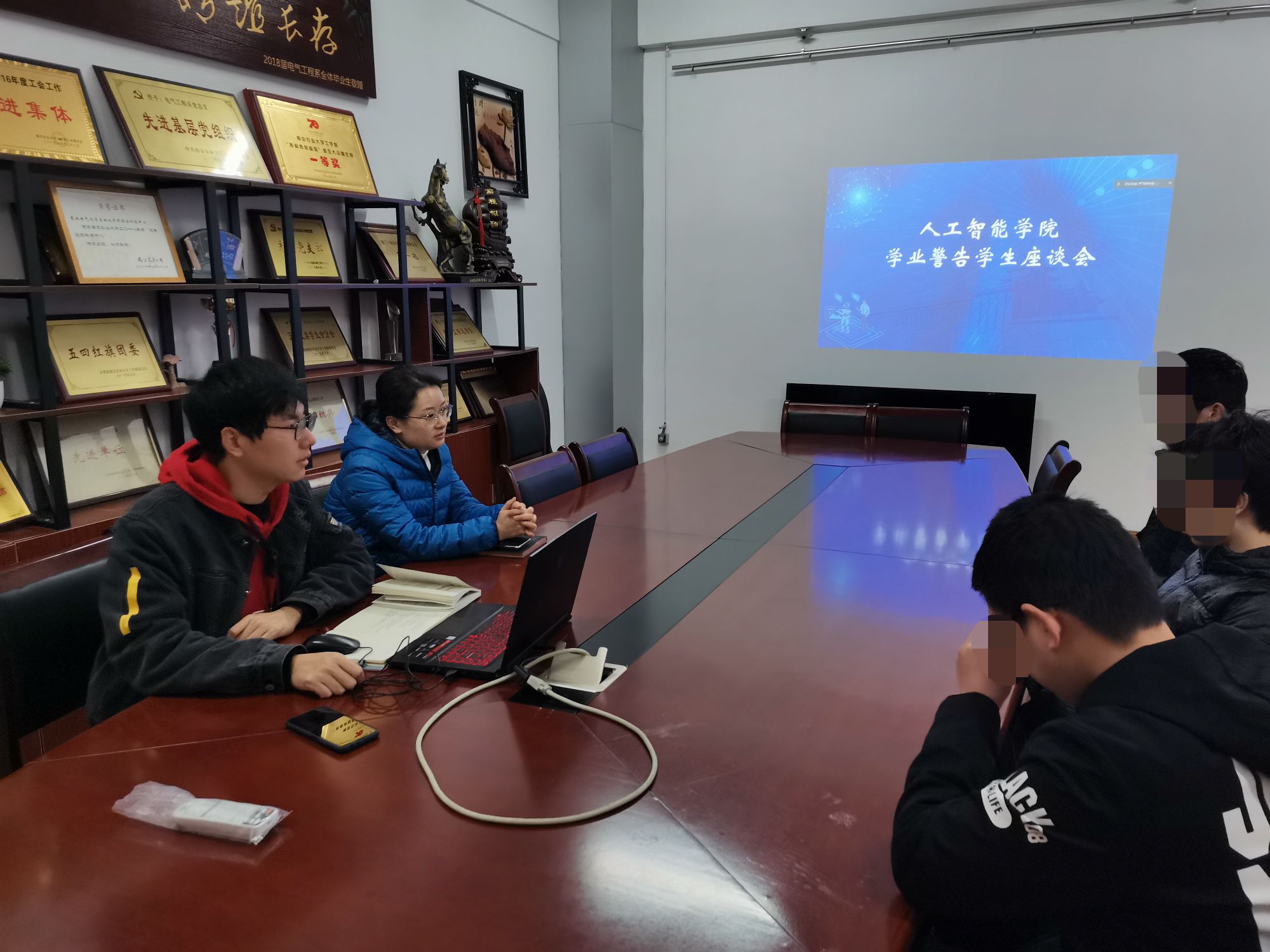 教学秘书韦伟、兼职辅导员赵立敢,以及本学期受到学业警告的五名学生参加本次会议,卫岗校区学生通过腾讯会议线上参会。