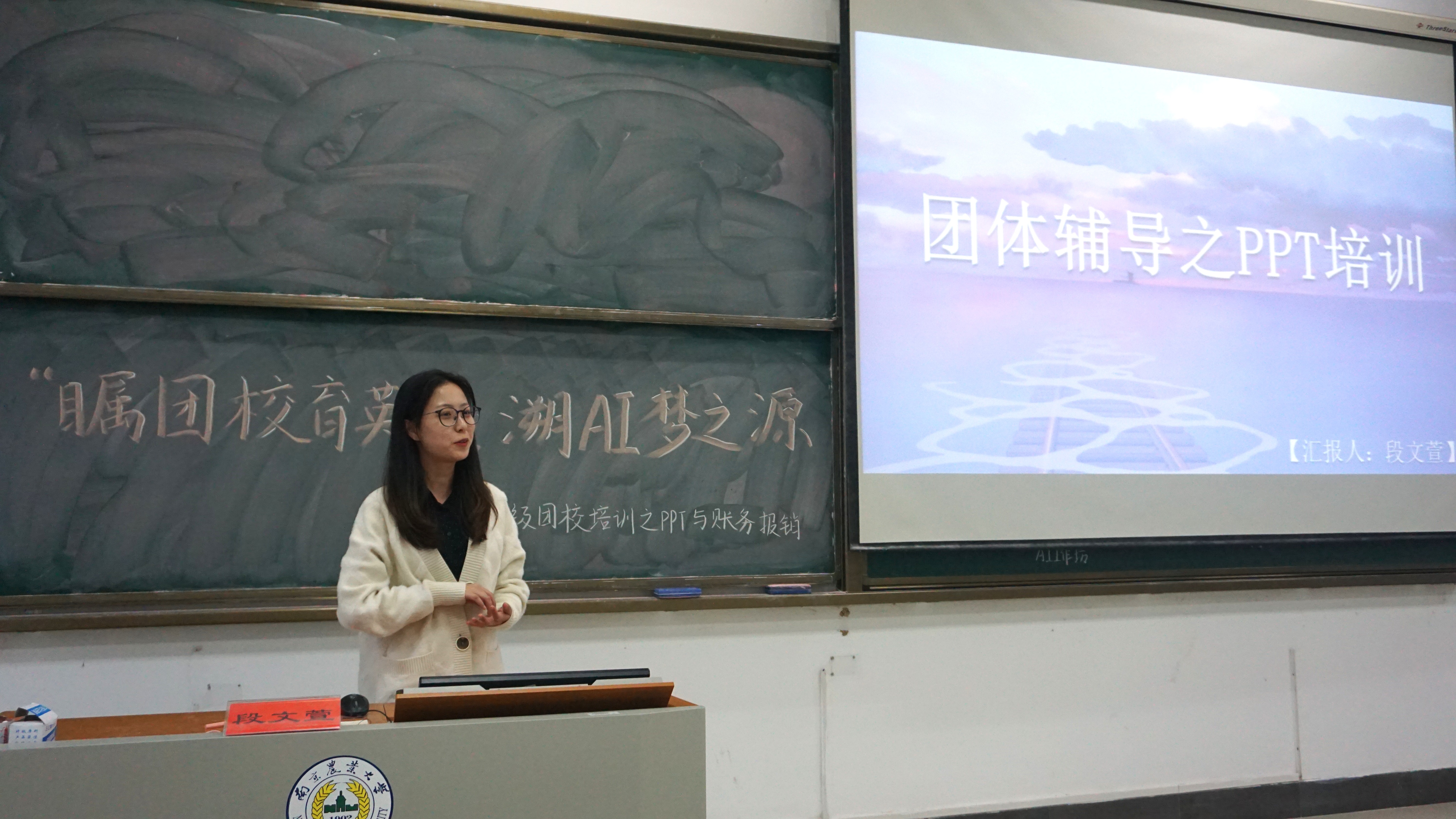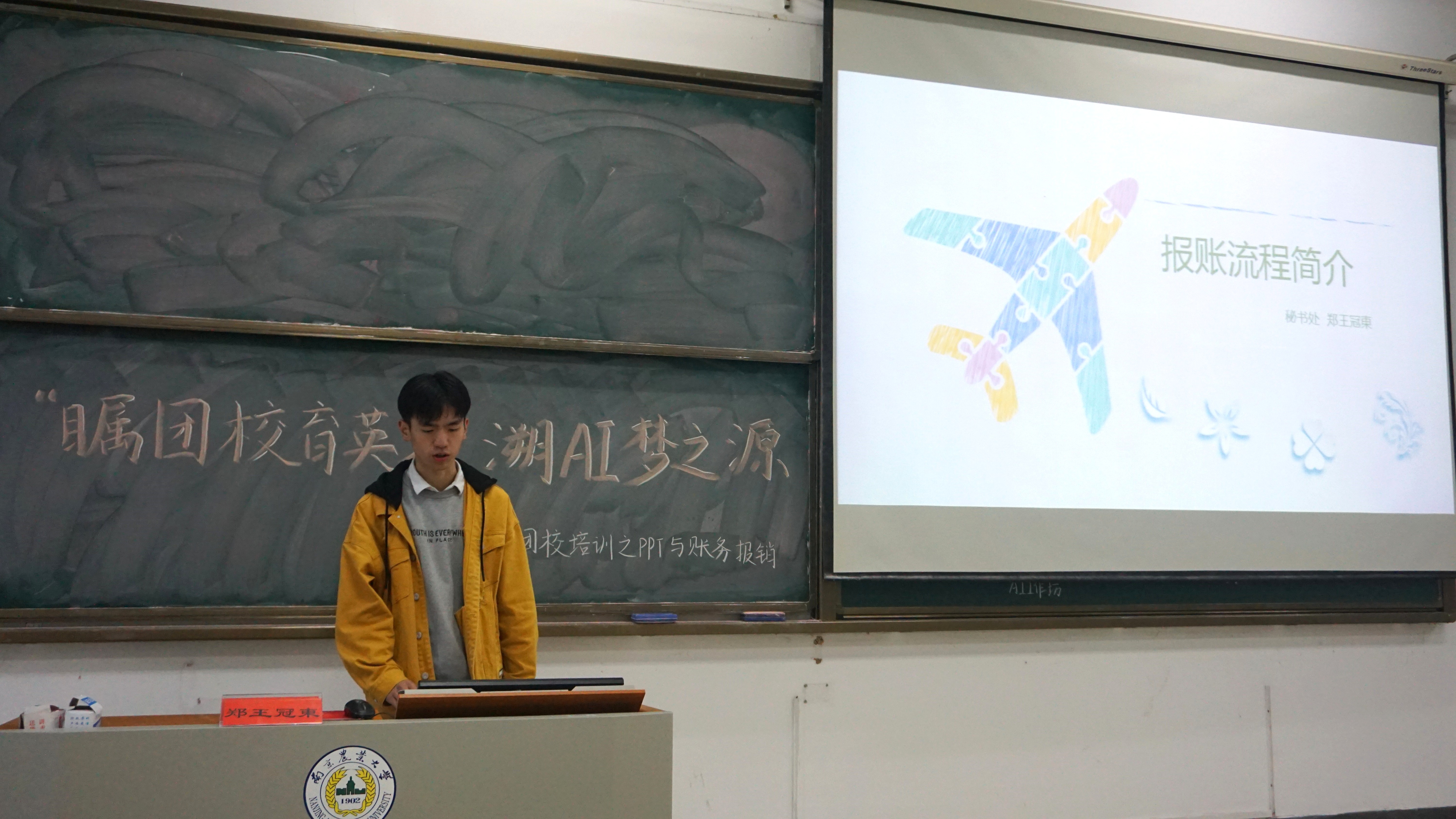 学生团委常委段文萱、学生会秘书处副部长郑王冠東出席本次培训,监察部袁妍璐主持。首先,郑王冠東从账务报销的必要性入手,介绍了账务报销的基本流程和注意事项。随后,段文萱就PPT整体制作、细节掌握和PPT讲解的注意事项等三个部分进行PPT培训。