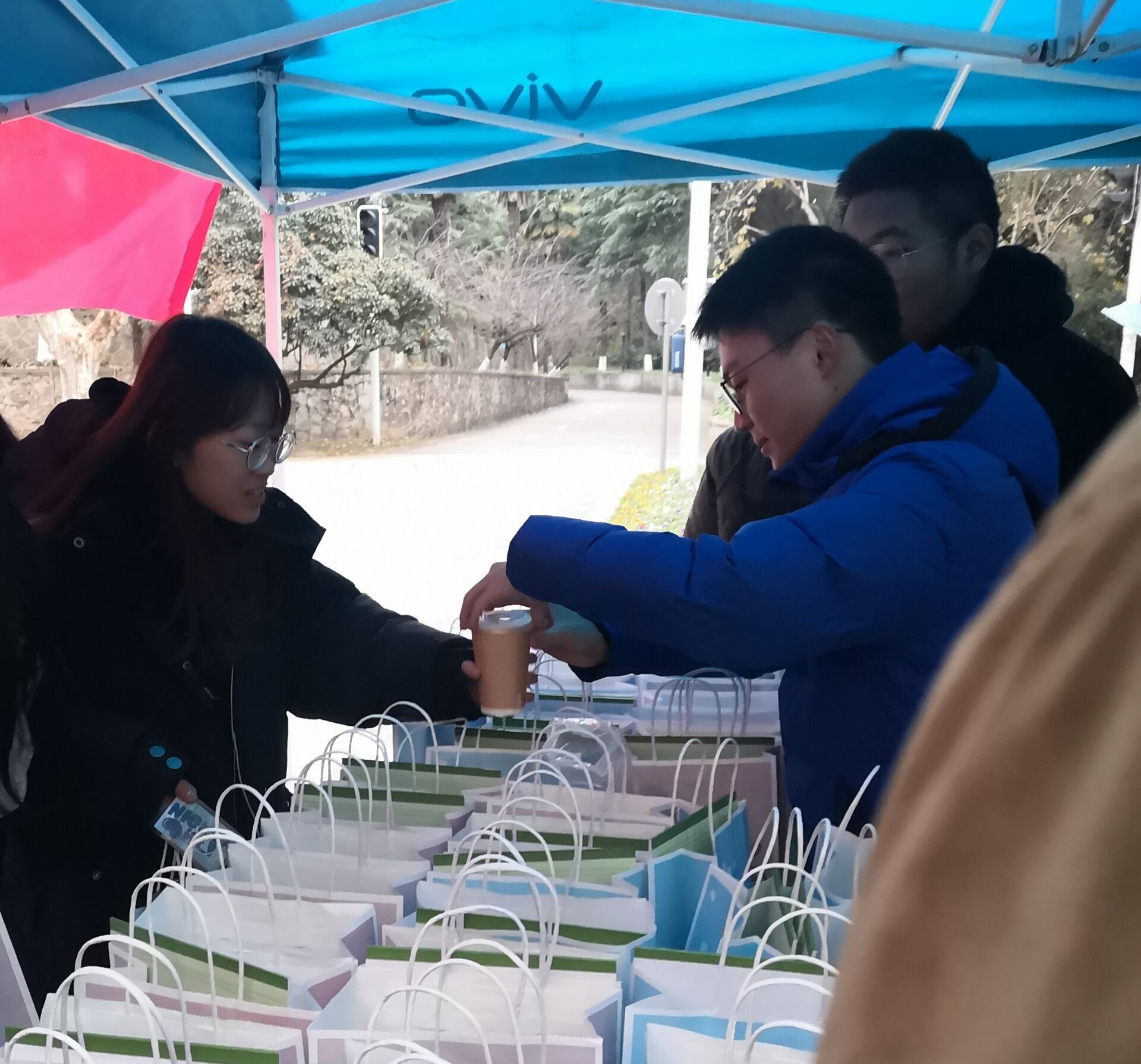 活动前期,青协与红会的志愿者们在图书馆、勤学楼、玉兰路支好帐篷、摆好福袋,冲上热乎乎的奶茶,等待着考研学子们的到来。晚饭时间,考研学子纷纷参与到活动中来,志愿者们为考研学子送上装满祝福明信片、蒸汽眼罩和巧克力的福袋与热腾腾的奶茶,鼓励大家注意休息,合理饮食,在冲刺阶段放平心态,坚持到底。活动现场气氛温馨,考研学子们露出开心的笑容,表示活动给予他们极大鼓舞。