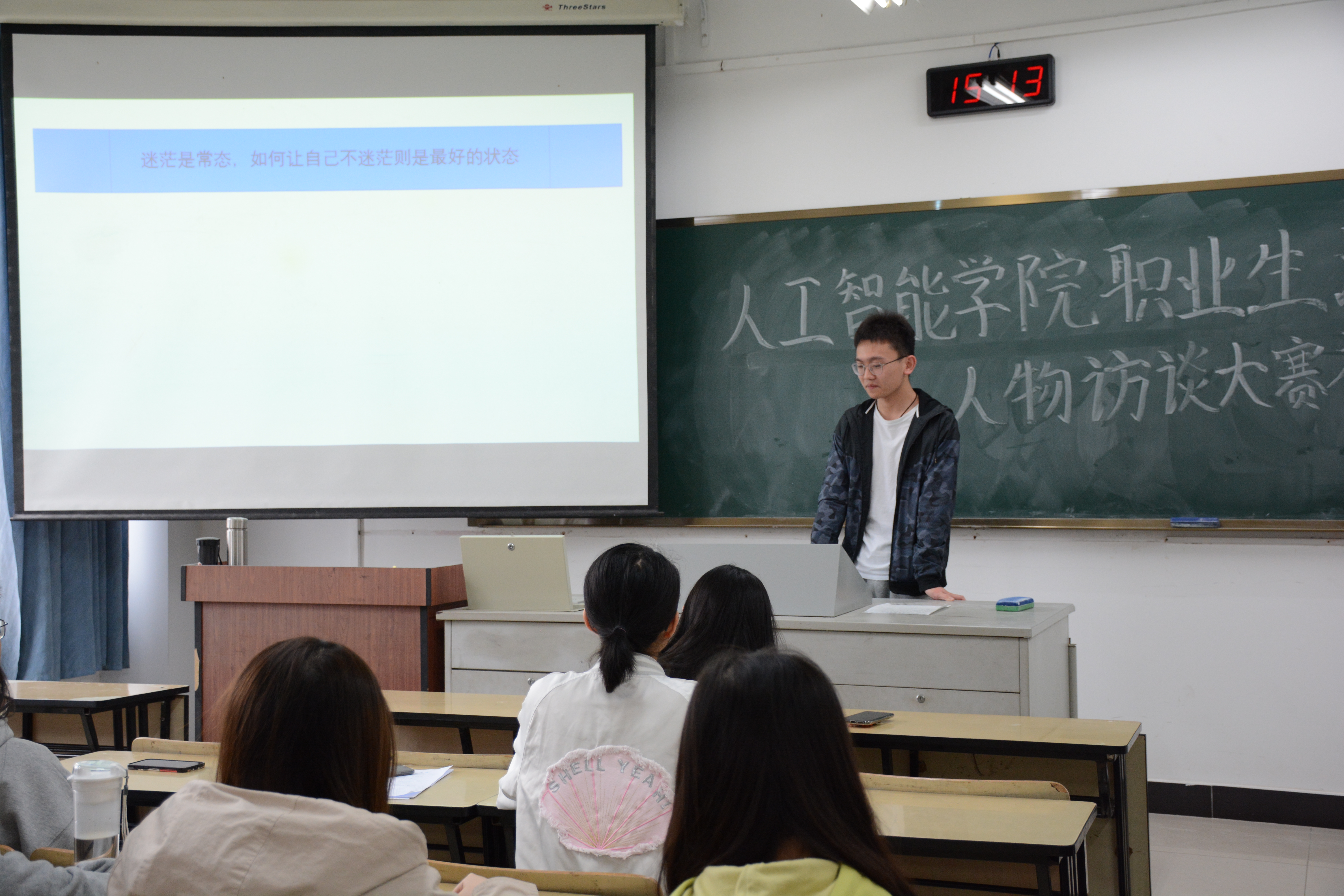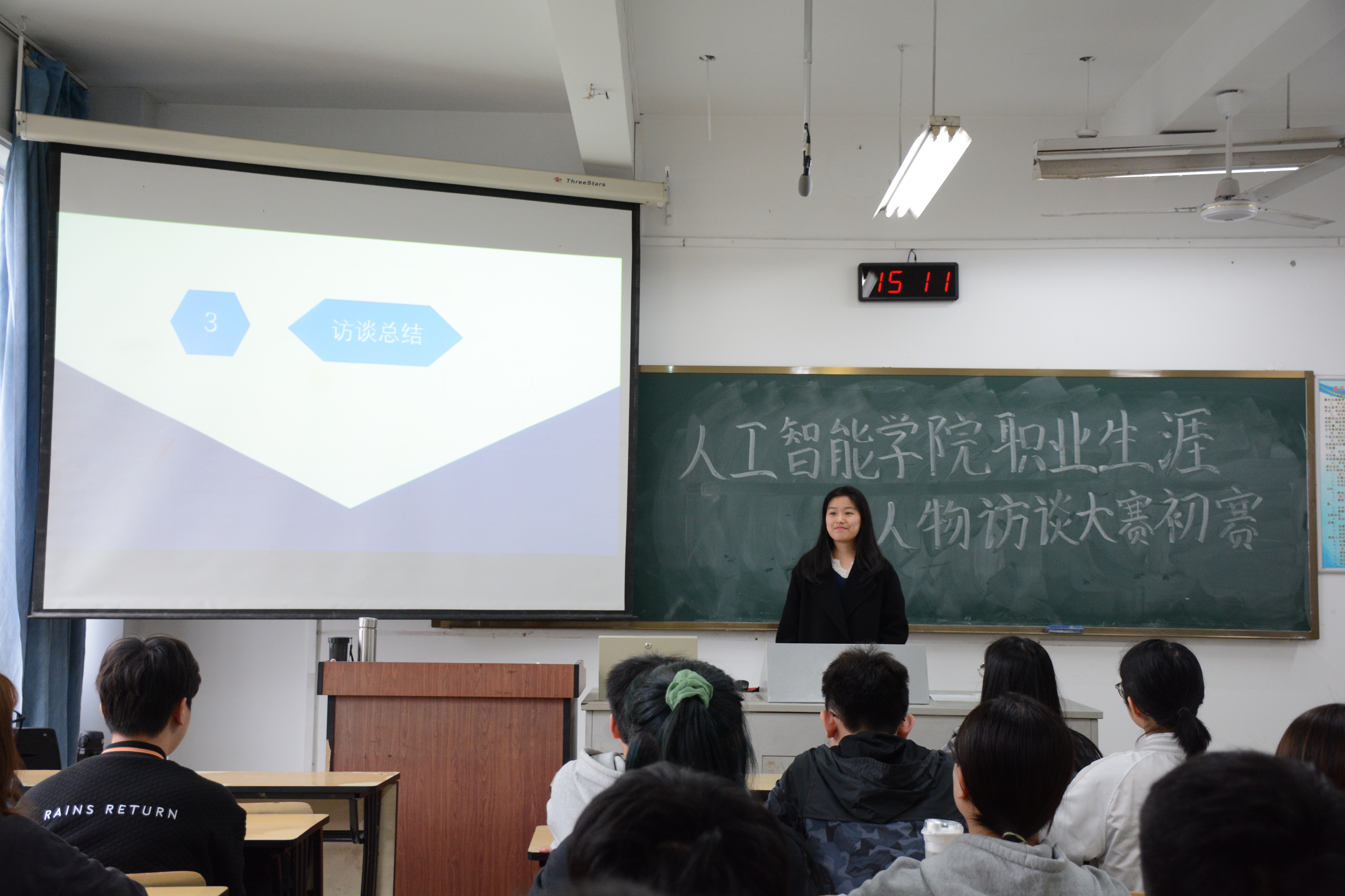 首先,主持人致开场词介绍了本次活动的宗旨,并宣读了初赛选手名单。随后,参赛选手们依次上台分享自己的访谈经历,从受访者的人生历程,以及自己与受访者的交谈记录等多方面进行讲述,并对各自的访谈做出了深刻的总结。参与本次访谈的对象是来自不同学科领域的优秀人士,其中包括资深教授、保研或出国留学的学生等。本次大赛中选手们表现优秀,观众们也认真聆听,现场掌声阵阵。经过评委团的讨论与打分,最终决出进入复赛的选手:电信184王雨祺、数据201李源、数据201任素慧、数据201梅秋怡,他们的访谈与展示做得充实而出彩,赢得评委与观众的一致好评。