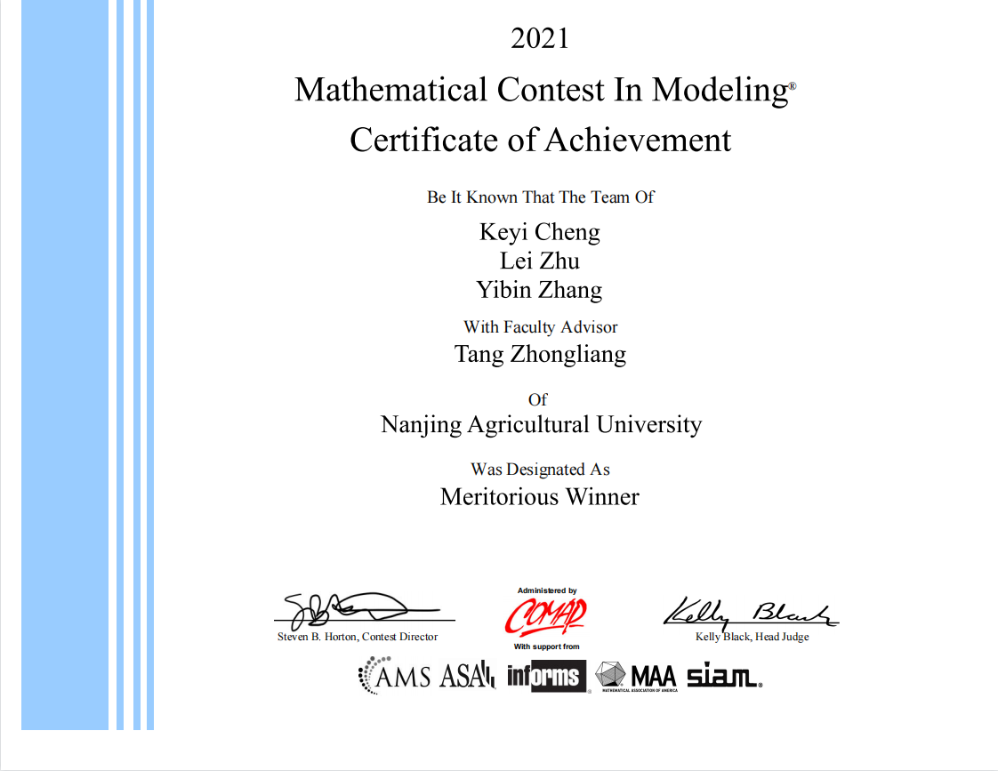 美国大学生数学建模竞赛由美国数学及其应用联合会主办,是世界范围内最具影响力的数学建模竞赛之一,也是现今各类数学建模竞赛中最早赛事之一。赛事着重强调对问题的深入研究、模型建立和解决方案的原创性、实用性、团队合作、交流以及结果的合理性。竞赛奖项设立6个等级,分别为Outstanding Winner(简称O奖)、Finalist Winner(简称F奖)、Meritorious Winner(简称M奖)、Honorable Mention(简称H奖)、Successful Participant(成功参赛)、Unsuccessful Participant(未成功参赛)。
