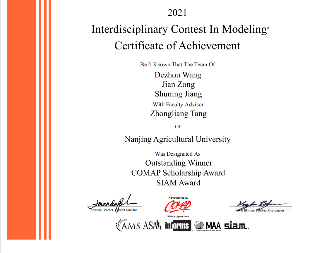 王德州同学自入学以来,连续获得国家奖学金、三好学生一等奖学金、科技创新奖学金、单科优秀奖学金、优秀共青团员等荣誉,更是在科技竞赛方面荣获全国大学生数学竞赛一等奖等10余项奖励。此次竞赛,王德州有备而来。他入学以后便加入数学建模协会,于2018年12月初次尝试了小美赛,由于学习的知识有限和经验的不足,仅获得了S奖。在大一下学期参加了数学建模“认证杯”比赛,获得二等奖。大二下学期开始与宗健、蒋舒宁组队,参与国赛并获江苏省三等奖。随后他们不断尝试,练习往年习题,积累模型经验,学习Edraw、Origin、PPT等绘图软件并掌握Latex排版。他们分工明确,各有所长,比赛时一起进行每一问具体模型想法的讨论,最终获得O奖的优异成绩。