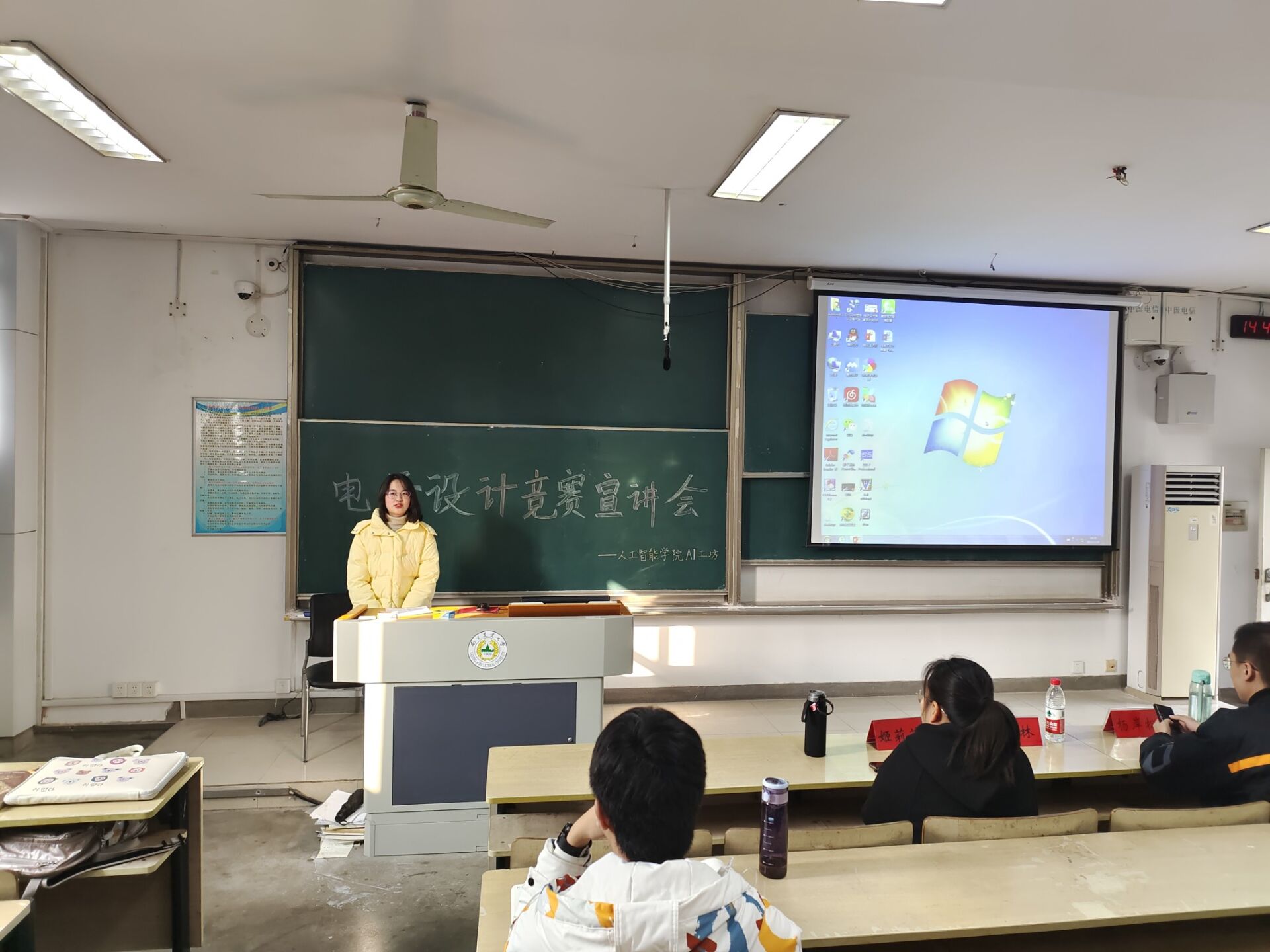 电子信息系主任李林老师,学生代表杨岸松、姬莉莉担任主讲人,从比赛内容、比赛流程、赛事特点等方面为同学们答疑解惑。随后进入答疑环节并发放了调查问卷,同学们在此过程中积极提问,主讲人的耐心解答使同学们对比赛更加了解,激发同学们的参赛兴趣。