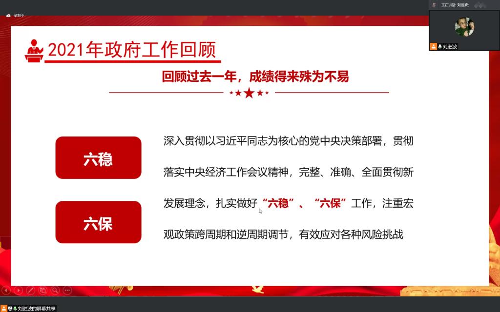 交流会开始,刘进波提出本次交流会的目的:关注两会,聚焦两会。本次交流会从2021年政府工作回顾、2022年主要预期目标以及2022年政府工作任务三个方面进行学习。接着提出了2021年是党和国家历史上具有里程碑意义的一年,“六稳”、“六保”工作落实到位,新发展理念贯彻落实。主持人的介绍让同学们明确面临的问题与挑战。就经济社会发展总体要求、发展主要预期目标及目标任务等方面阐述2022年国家主要预期目标。紧接着刘进波又通过两段视频,让我们深入了解两会所提出的2022年主要预期目标,以六个关键词加深对预期目标的阐释。之后提出以加快构建新发展格局,推动高质量发展,扎实做好各项工作为政府工作的主要任务,并从经济发展、民生发展、政府建设、外交建设、环境建设等十四个方面详细地阐述了2022年政府工作任务。最后,刘进波提出:中国的发展从来都是在应对挑战中前进的,中国人民有勇气、智慧和力量战胜艰难,呼吁同学们学习全国两会精神以赓续时代精神。至此,交流会圆满结束。