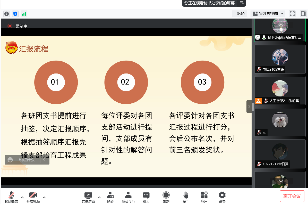 各支部按照顺序依次进行了详细的汇报。魏宇宁、吴予欣、李铠志、刘涛就各支部建设情况、特色项目等进行点评并给出建议。各团支部汇报完毕后,魏宇宁对所有支部建设情况进行了综合性的点评并提出相关建议,她希望:一、团支部要充分发挥自身特点,形成支部特色;二、支部间要多交流学习,不断提高综合素质;三、团干部要以身作则,发挥先锋模范作用;四、要结合当下形势,不断调整支部工作方式,做到与时俱进。