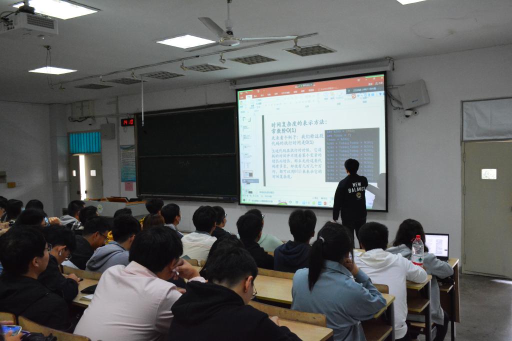 首先,为了同学们能够更好地理解所讲内容,吕付昊介绍了时间复杂度的概念,并列举了一些常用的时间复杂度,如常数阶,线性,平方,线性对数阶等。接着,吕付昊引入了这次培训的正题,即算法设计相关知识。他举例了递归,排序,二分查找,搜索等基本算法,然后着重对排序算法进行了深入介绍。通过板书、ppt和小动画结合的形式,吕付昊生动形象地介绍了归并排序、快速排序、冒泡排序、选择排序等排序方式。照顾到同学们大多是大一新生,对代码等方面操作和了解相对较少,吕付昊尽量回避在培训中出现过多代码。因此虽然培训内容较为复杂,但精细的讲解使同学们依然能够理解培训内容。最后,吕付昊向同学们介绍了ICPC、CSP-J/S、PAT、蓝桥杯等算法竞赛,并从语言基础、数学逻辑以及数据结构等方面介绍了提升算法水平的方法。培训结束,同学们掌声雷动,一致认为受益匪浅,活动取得圆满成功。