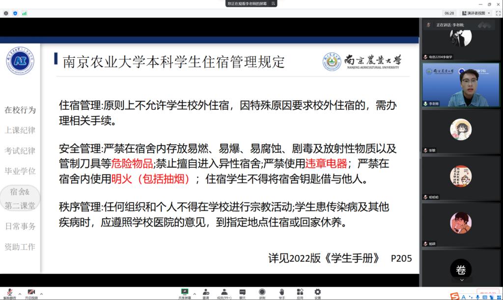 开展新生入学系列教育第二讲“校规校纪专题”。新生辅导员李洪老师担任主讲,2022级全体新生线上参加。