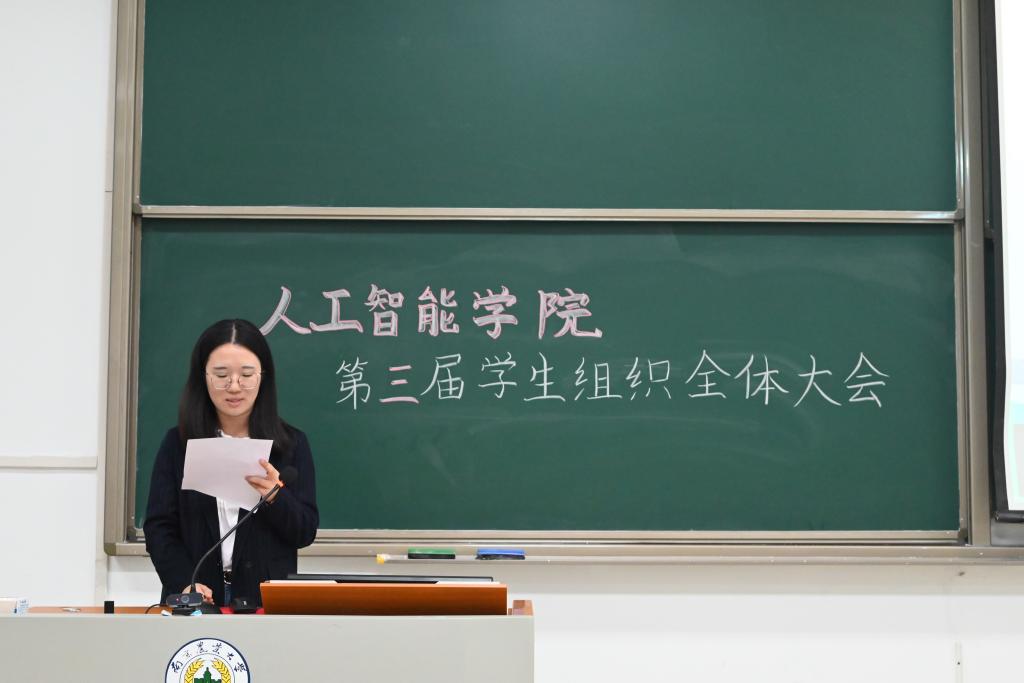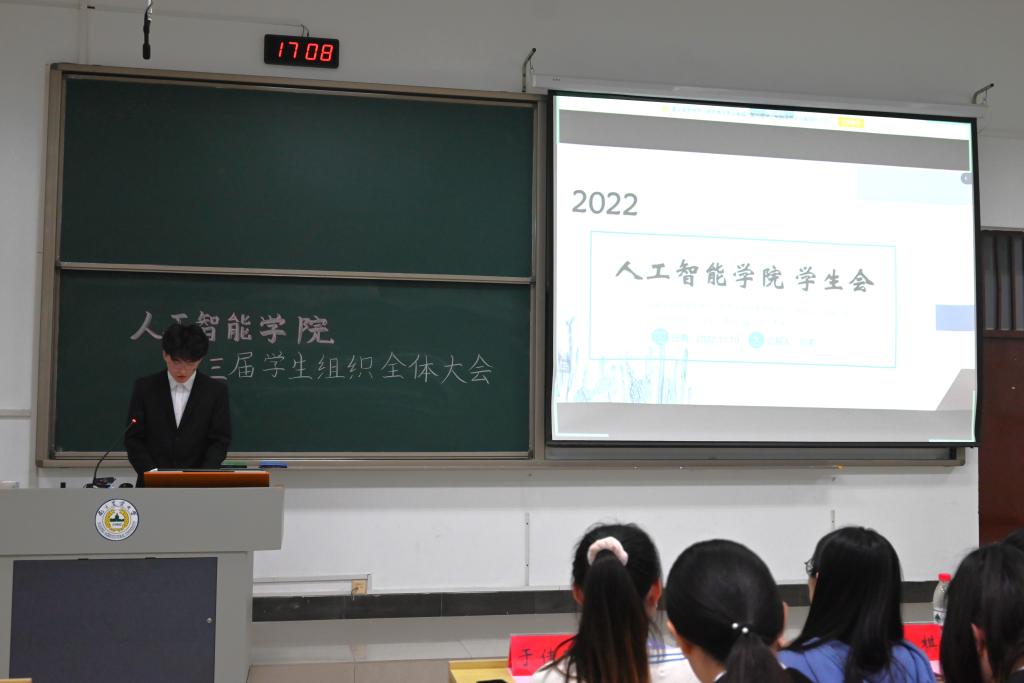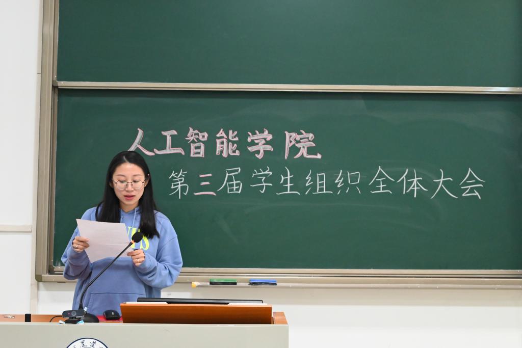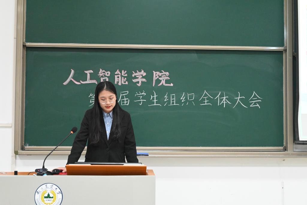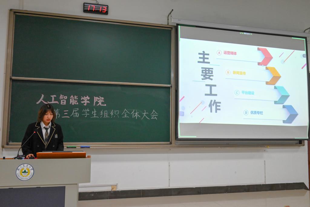 会议第二项,分党校秘书长南靖妍、学生团委副书记刘雅彬、学生会执行主席刘涛、全媒体中心主任梅秋怡、AI工坊主席王楚涵依次上台,分别介绍赌博网