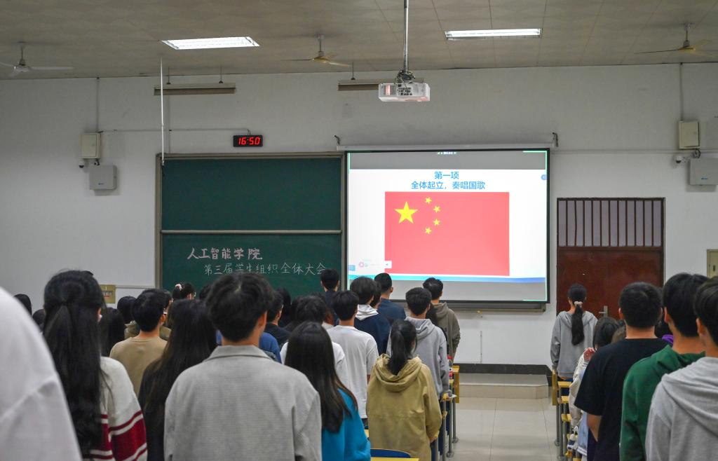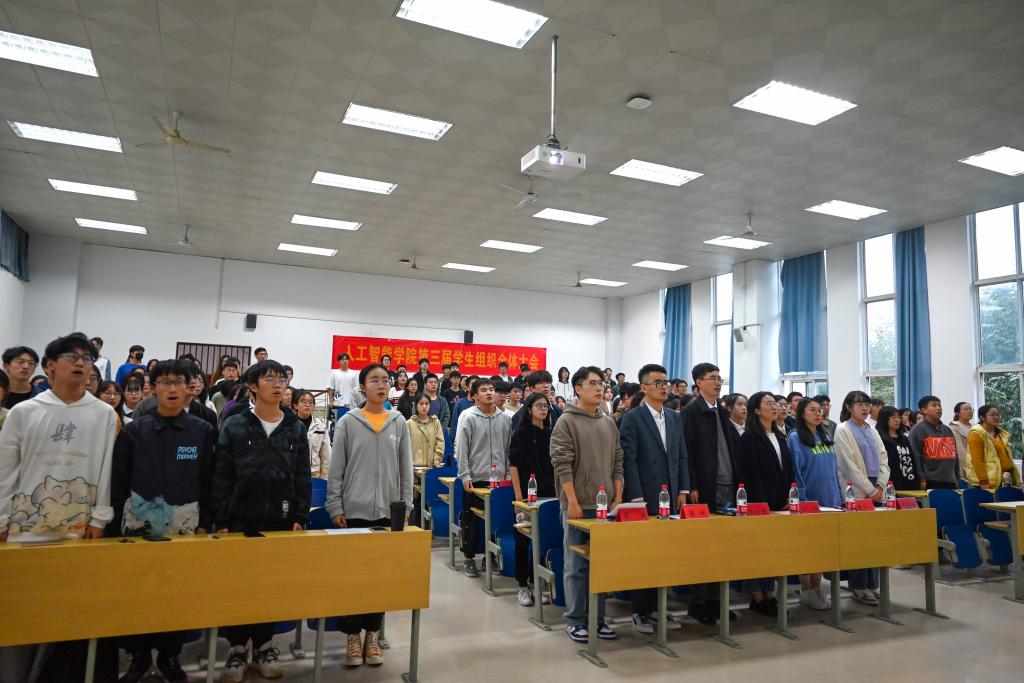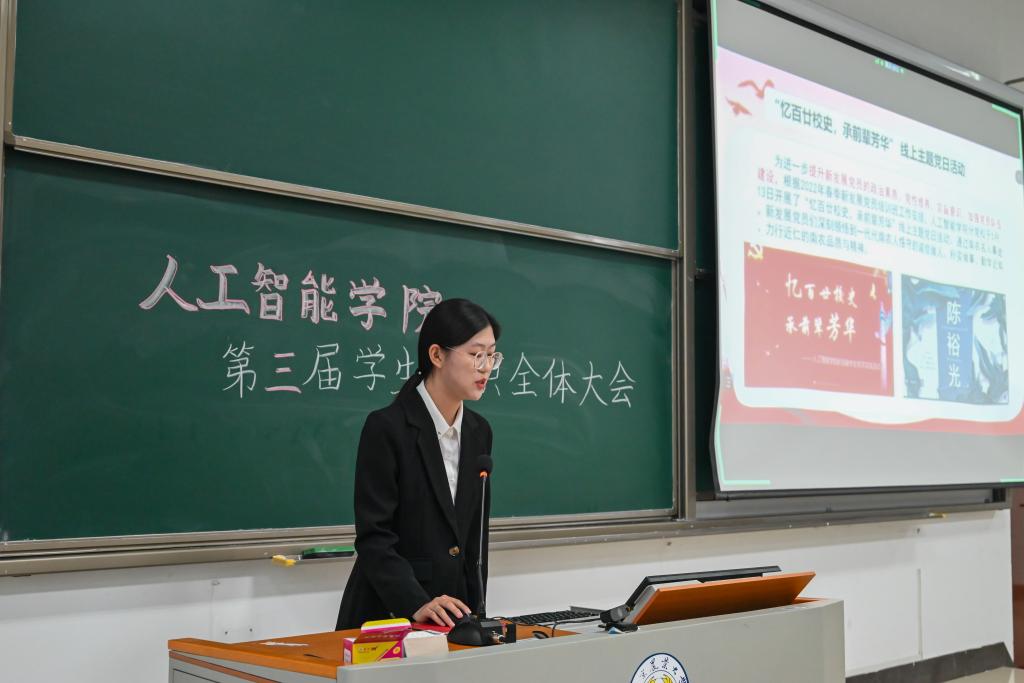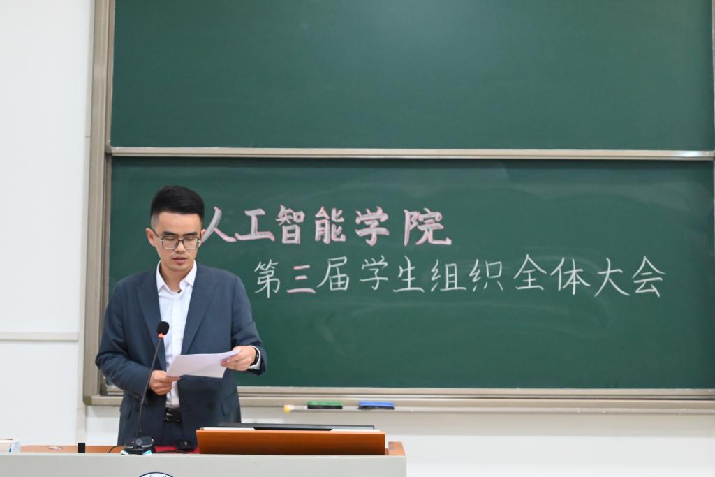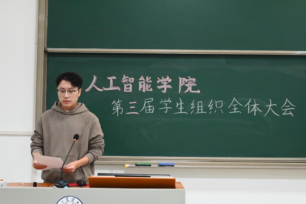 会议第二项,分党校秘书长南靖妍、学生团委副书记刘雅彬、学生会执行主席刘涛、全媒体中心主任梅秋怡、AI工坊主席王楚涵依次上台,分别介绍赌博网