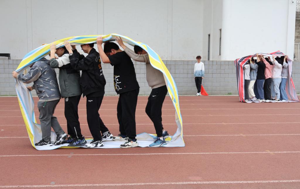 本次运动会共有四个项目。运动会开始,首先进行的项目是“团结奋进”:每队派出6名队员,用双手举起器械行进。这一项目是对参赛队伍成员之间相互协作以及合作能力的考验。