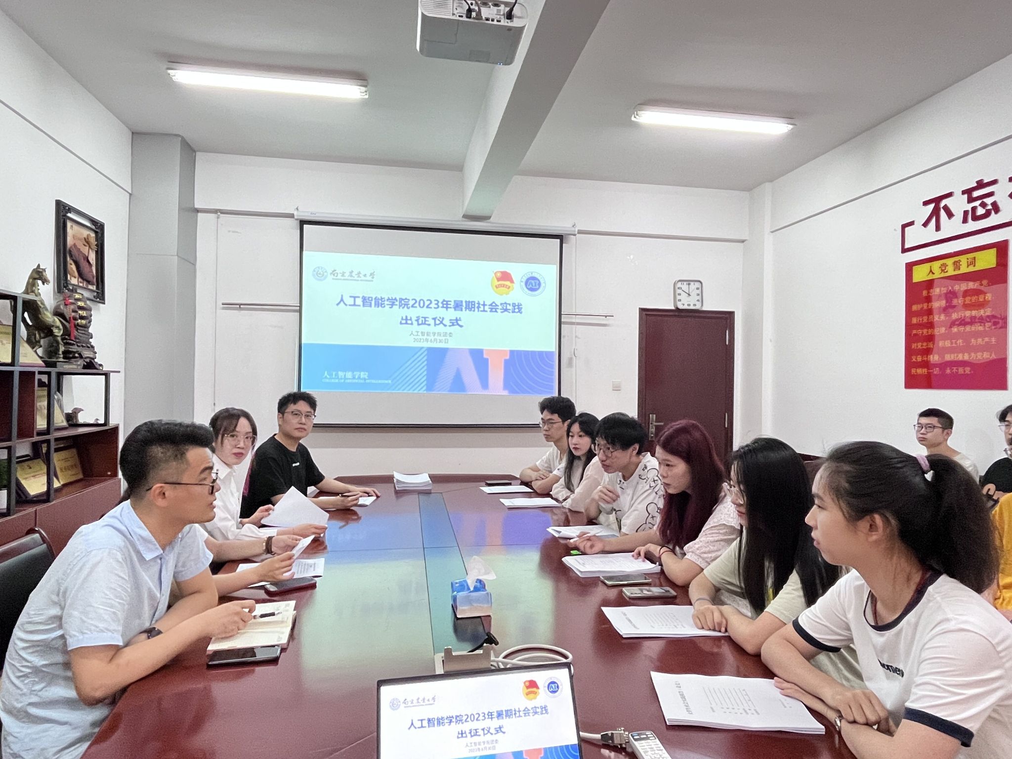 于6月30日在育贤楼B311会议室举行2023年暑期社会实践出征暨授旗仪式。院学生工作办公室主任兼团委书记章棋,院学生工作办公室副主任兼团委副书记湛斌,本科生辅导员李洪、于佳琪出席本次会议。各重点实践团队负责人、信息员参加本次出征仪式。