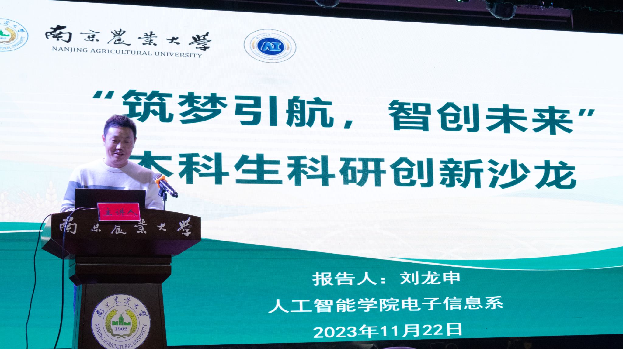 刘龙申老师阐述了团队在智慧畜牧养殖技术装备方面的研究情况,并结合自身学生时代科创经历,鼓励和引导同学们做好学业规划、积极参与科研活动。
