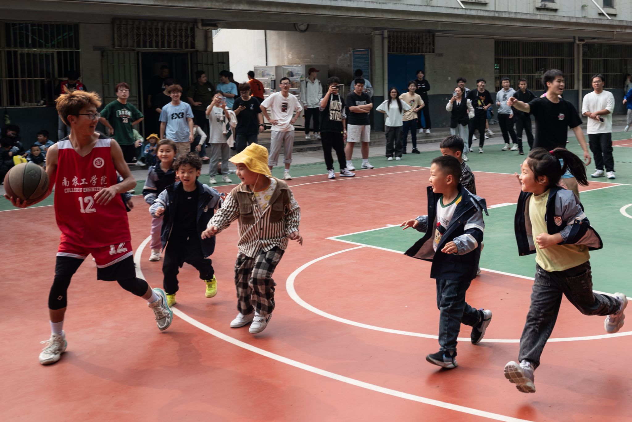 绘画结束,小朋友们还在校园里自由活动,感受着大学生的活力与朝气。在篮球场上,大学生们友善地陪伴着小朋友们玩耍,欢声笑语此起彼伏,构成了一幅幅温馨而美好的画面。