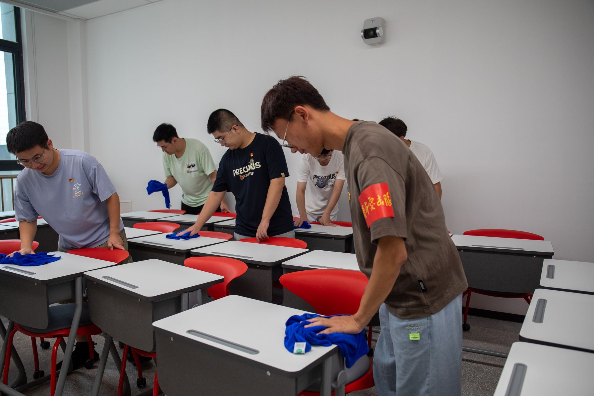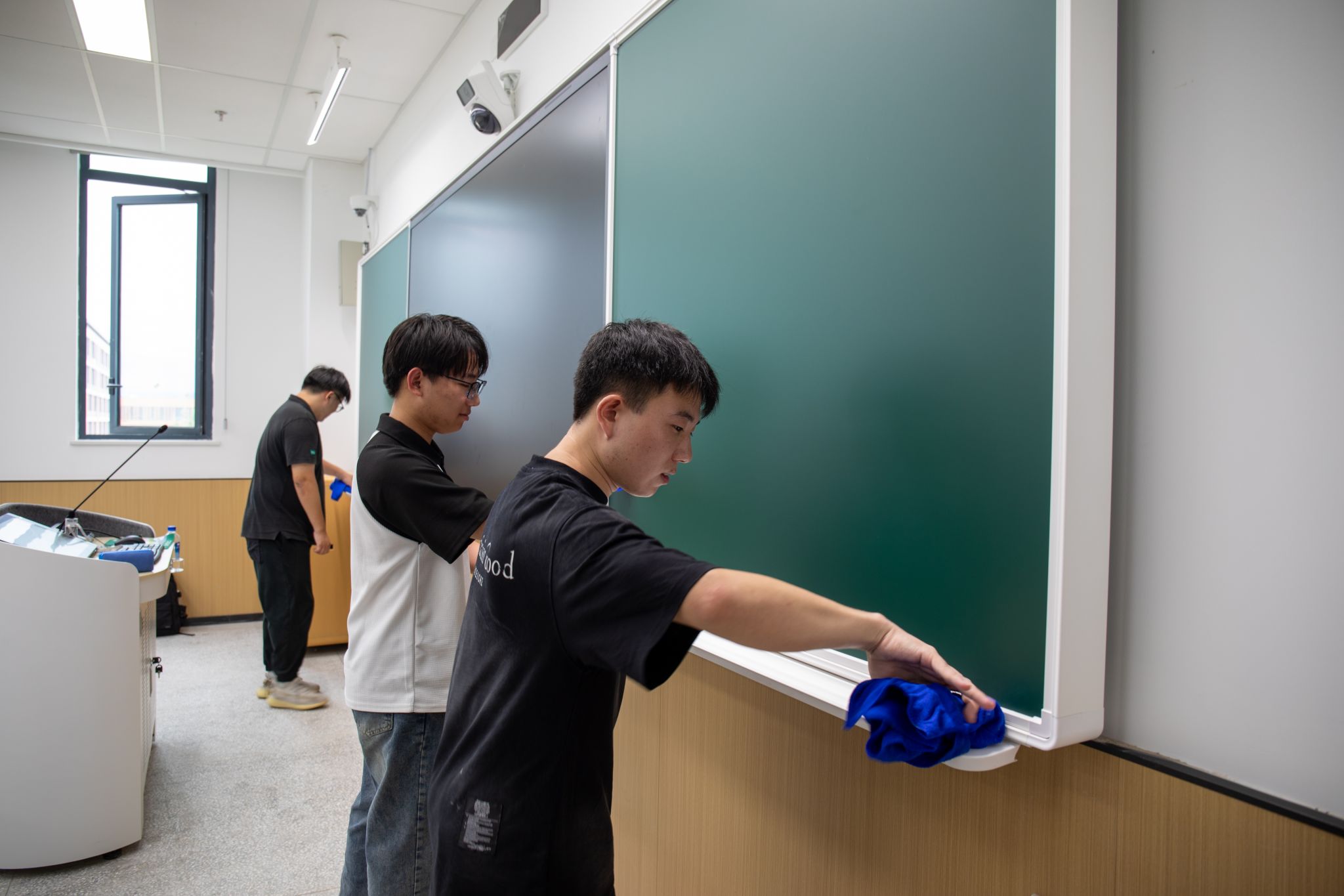 师生以党支部为单位领取工具,分别前往公共教学楼D面共28间教室开展大扫除工作。从桌椅、门窗再到黑板讲台,各支部组织有序、分工明确,充分发扬“不怕脏、不怕苦、不怕累”的精神,对教室每个角落都进行了全面细致地整理和清扫。活动结束后,教室焕然一新,为学校师生营造了舒适整洁、卫生有序的上课环境,大家纷纷表示,要在身体力行的劳动中强化实践能力,锤炼敢于担当的意志品格。