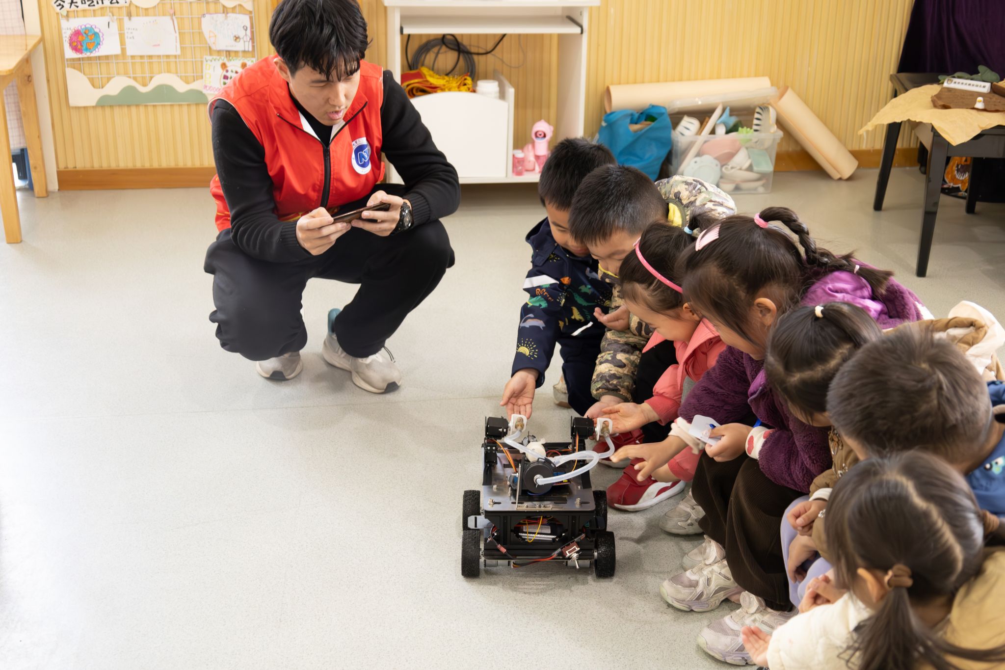 工作人员的精心组织下,志愿者们手把手地协助小朋友们动手制作纸质机器人模型,体验农业智能遥控车,志愿者用简单易懂的语言和生动的例子,为小朋友们打开了农业科技的大门,让幼儿园小朋友们在实践中学习科技知识,感受科技的魅力。活动结束后,志愿者们与幼儿园的小朋友及老师进行了合影留念。本次宣讲活动在多方密切配合下圆满结束。