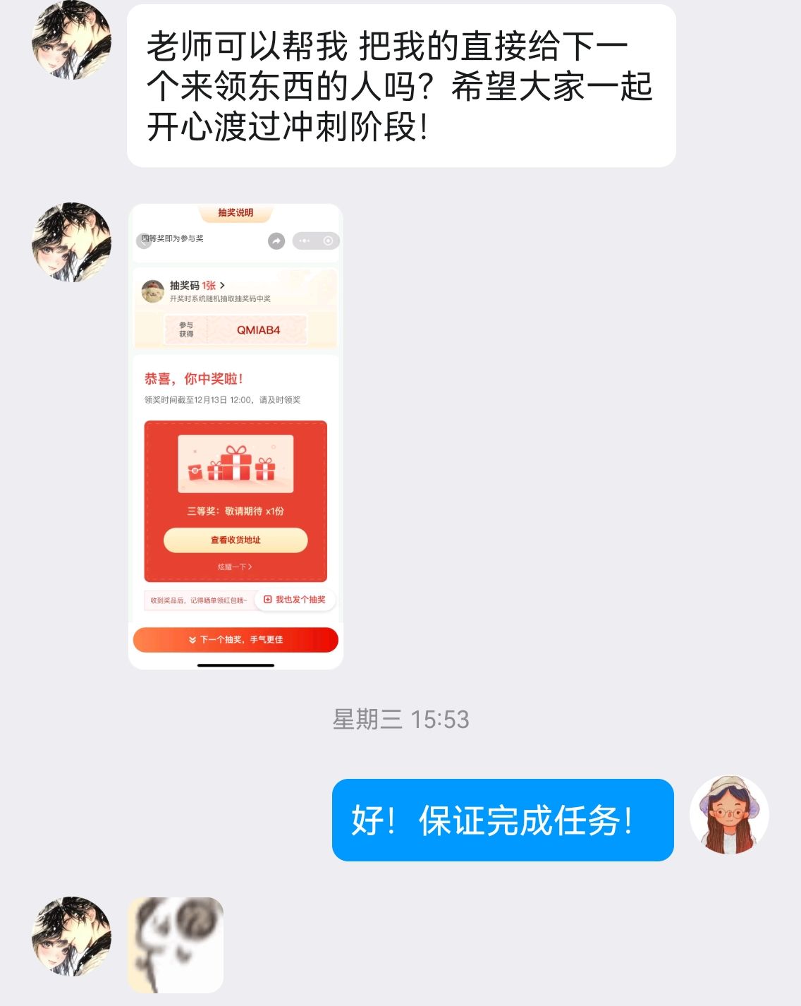 “老师可以帮我把礼物直接给下一位来领礼物的同学吗?希望大家一起开心度过冲刺阶段!”活动中考研学子们也互相传递喜悦与幸福,展现出智能院学子互帮互助的良好风貌。同时,未能及时到场领奖的学子们也收到了来自赌博网