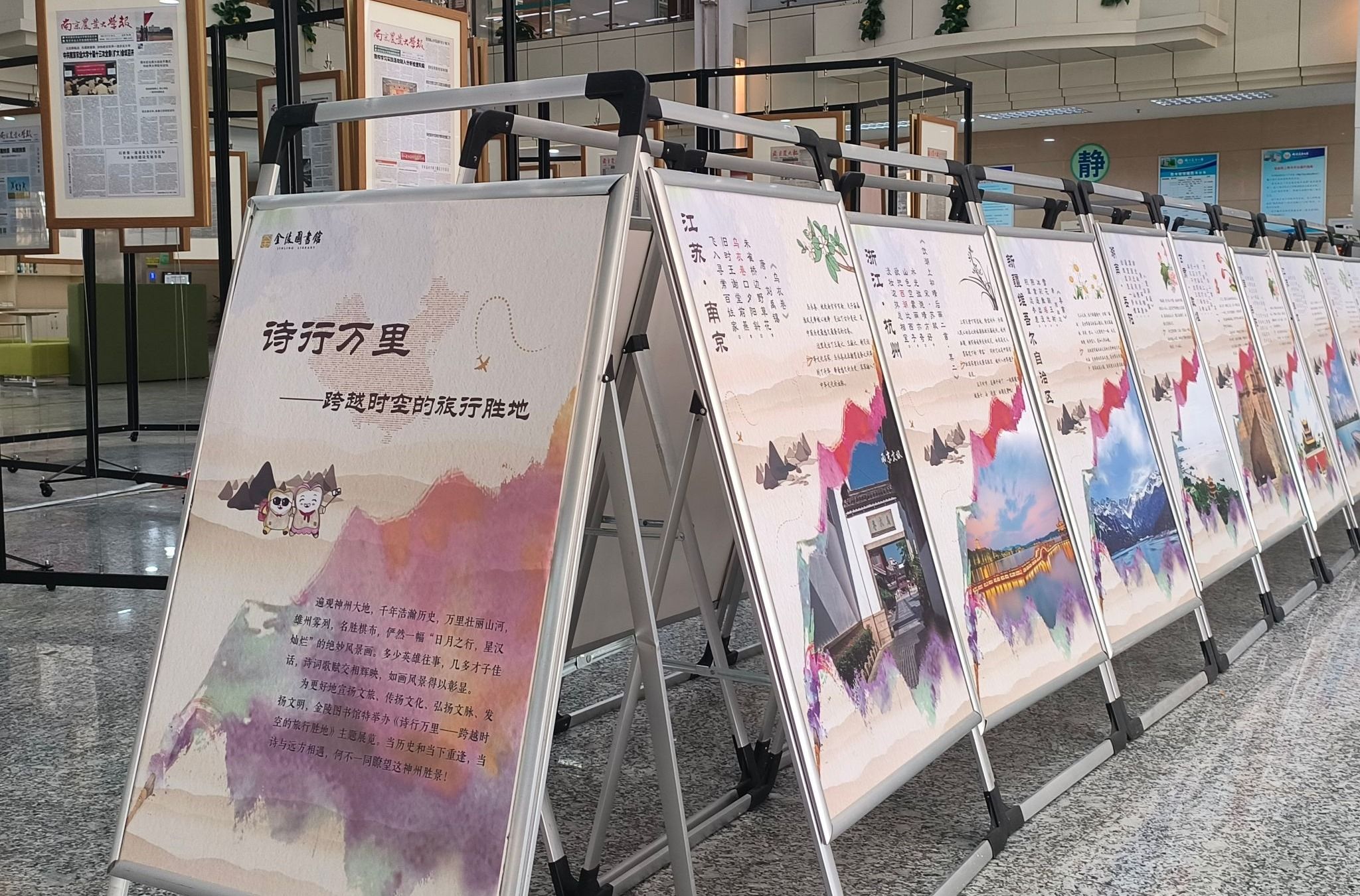 团委联合金陵图书馆打造的《诗行万里——跨越时空的旅行胜地》文化展在南京农业大学浦口校区图书馆精彩亮相。此次主题展览旨在宣扬文旅、传扬文化、弘扬文脉、弘扬文明,为我校师生带来了一场跨越时空的文化之旅。