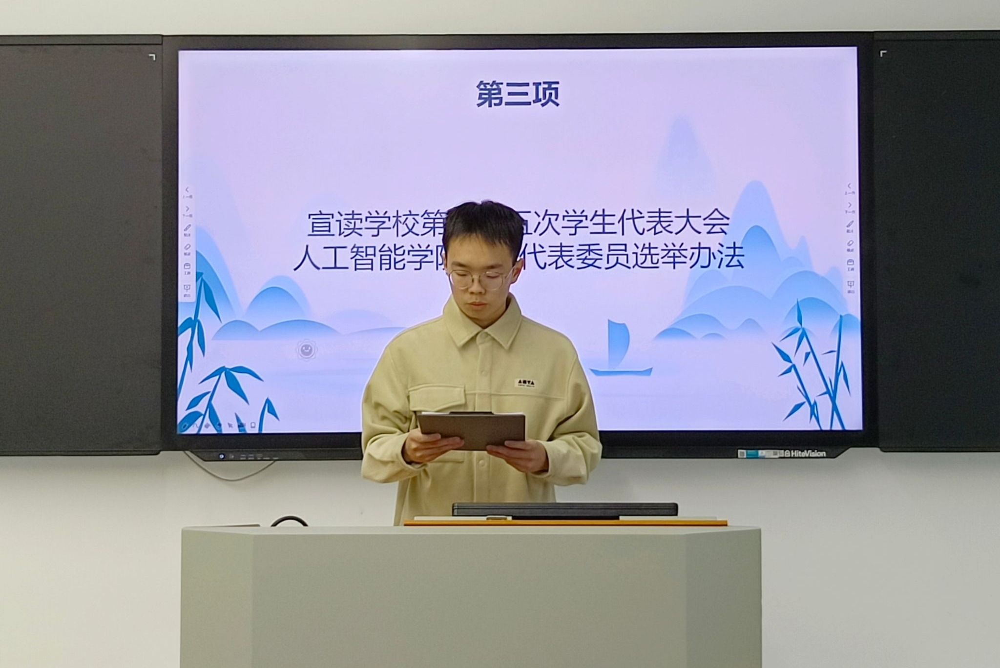 学生组织章程》相关规定。通过前期资格审查产生的4位候选人依次登台展开竞职演说。经过无记名投票、差额选举程序,阮林昊、张馨蕊、芮家辉三位同学当选第六届学生会执行主席团成员。新当选主席团代表阮林昊表示,将着力构建“AI+服务”新模式,打造具有学科特色的智慧型学生组织。