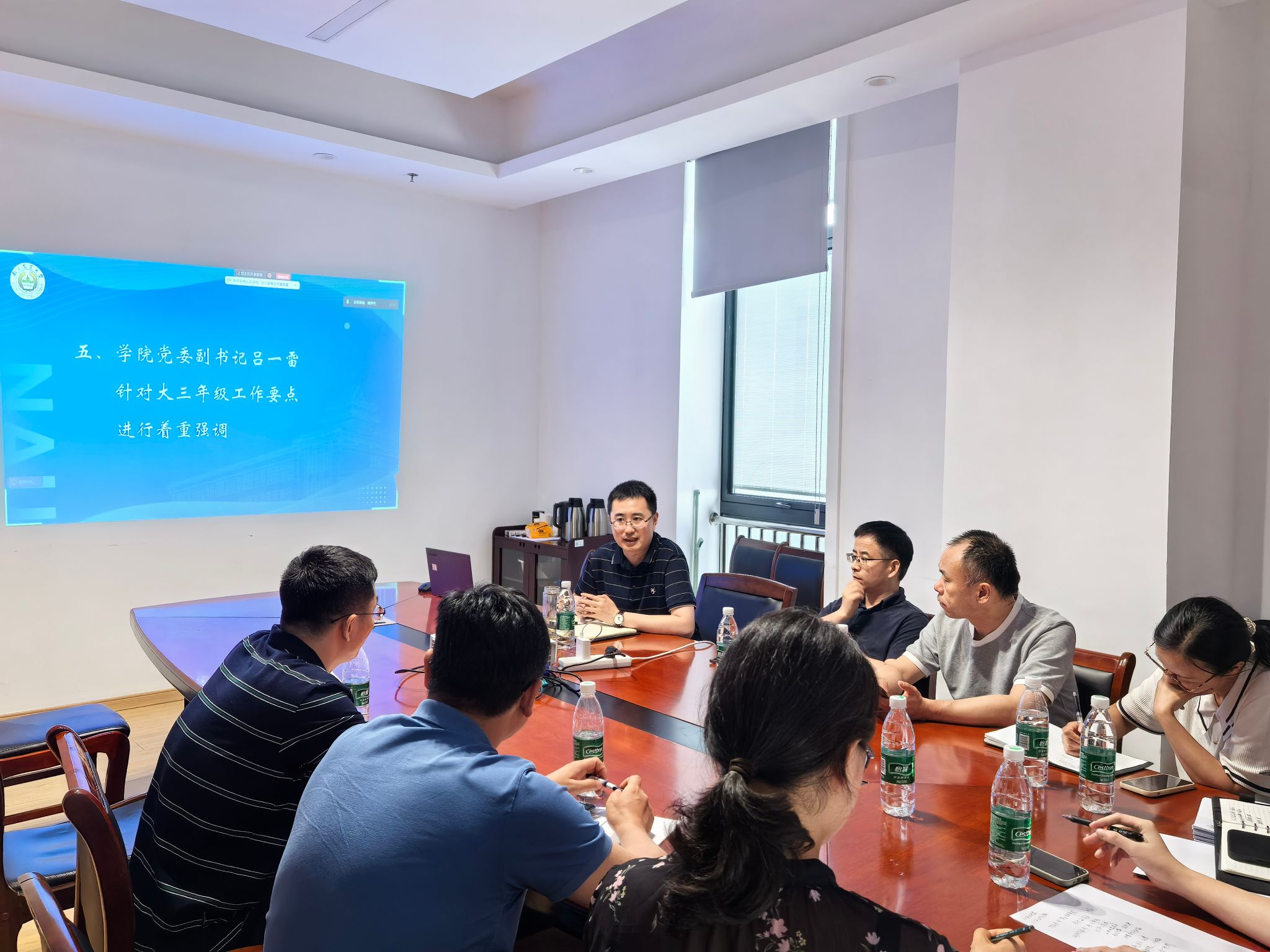 党委副书记吕一雷主持会议,校学生工作处就业中心主任周建鹏受邀作专题指导,优秀班主任代表杨红兵、教学秘书蒋菠、本科生辅导员魏宇宁与李洪,以及2022级全体班主任共同参会。