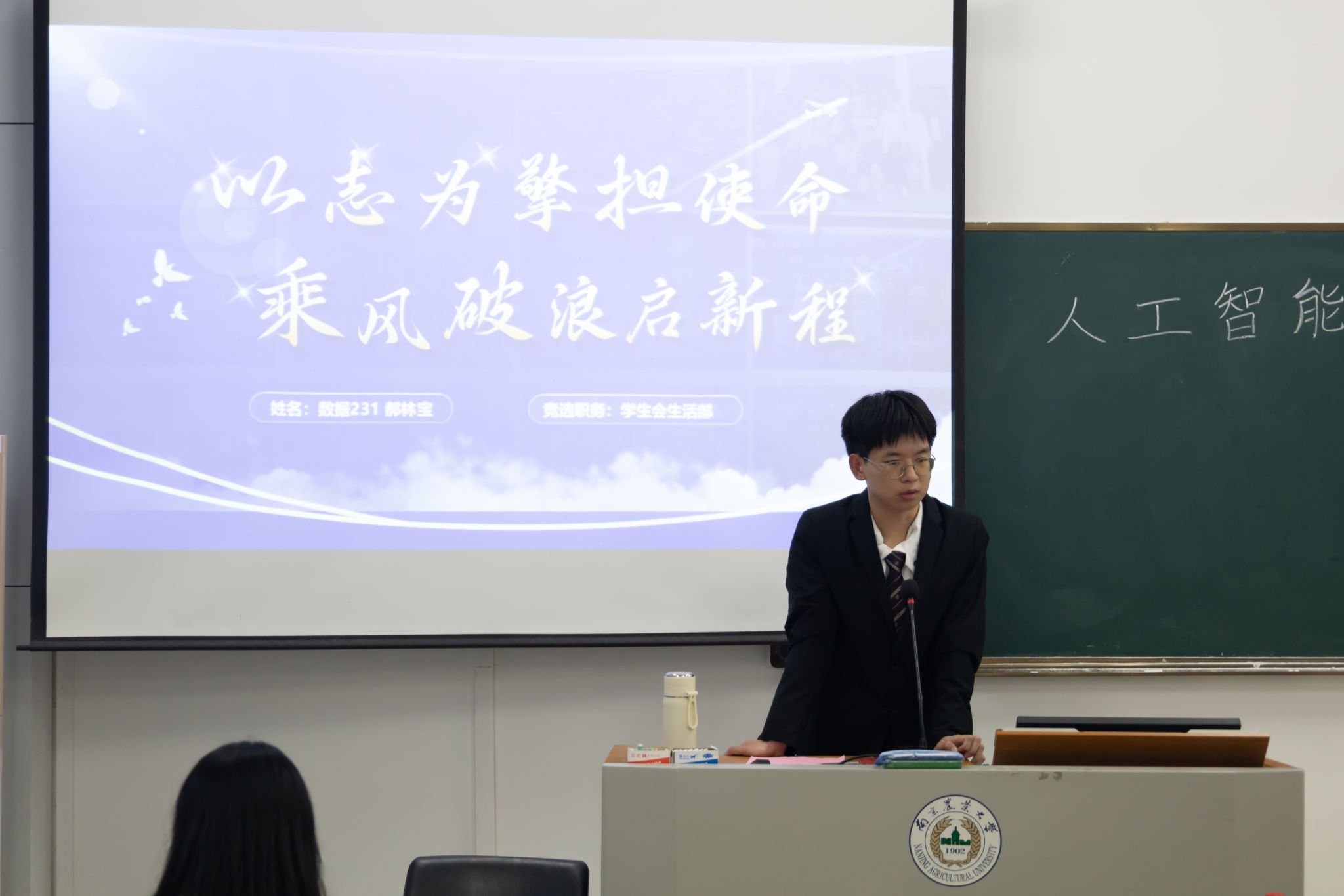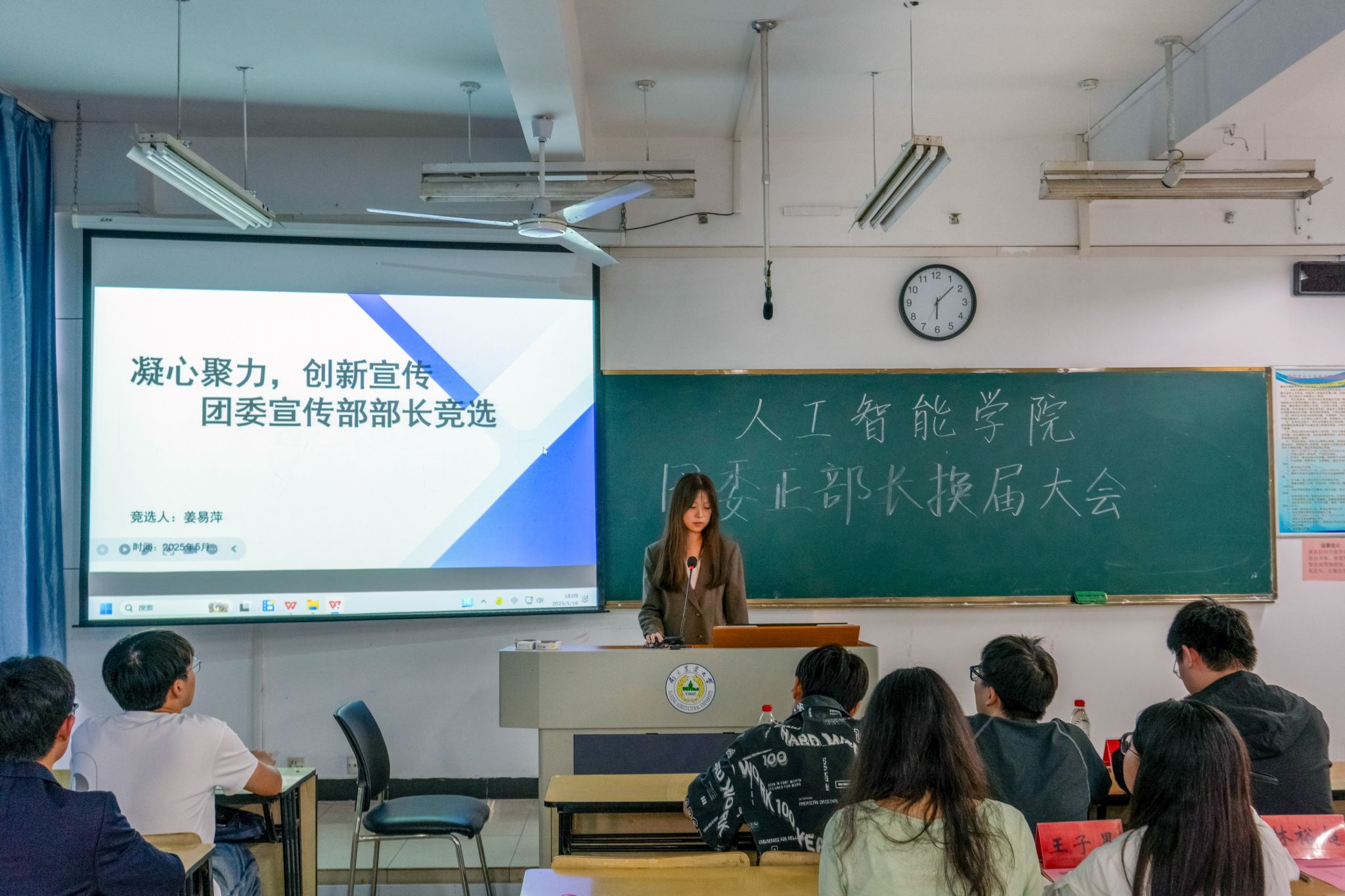 学生组织正部长换届选举章程》后,各候选人依次登台,通过“3分钟主题演说+2分钟即兴答辩”展现个人风采。