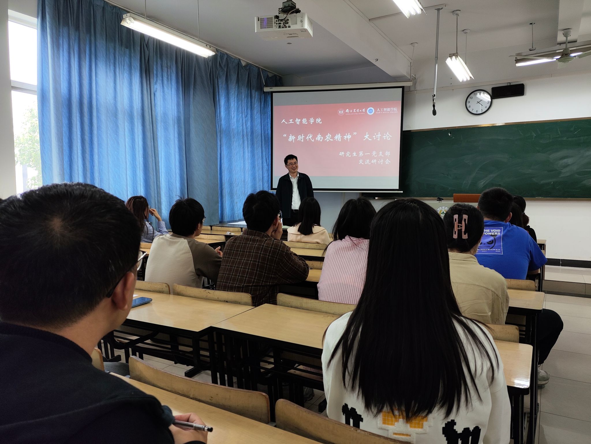 党委副书记吕一雷,研究生全体党员和学生代表参加研讨。围绕“新时代南农精神与人工智能创新实践”的核心议题,参会党员和学生代表积极发言,分享了各自在学习、科研中的心得体会,探讨了如何将南农精神融入人工智能科研与社会服务中,以科技赋能农业现代化,促进乡村振兴。会议最后,吕一雷书记做讨论总结。他表示,希望支委们认真梳理会议成果,将其转化为具体行动计划,推动南农精神在人工智能领域的创新实践中落地生根、开花结果。