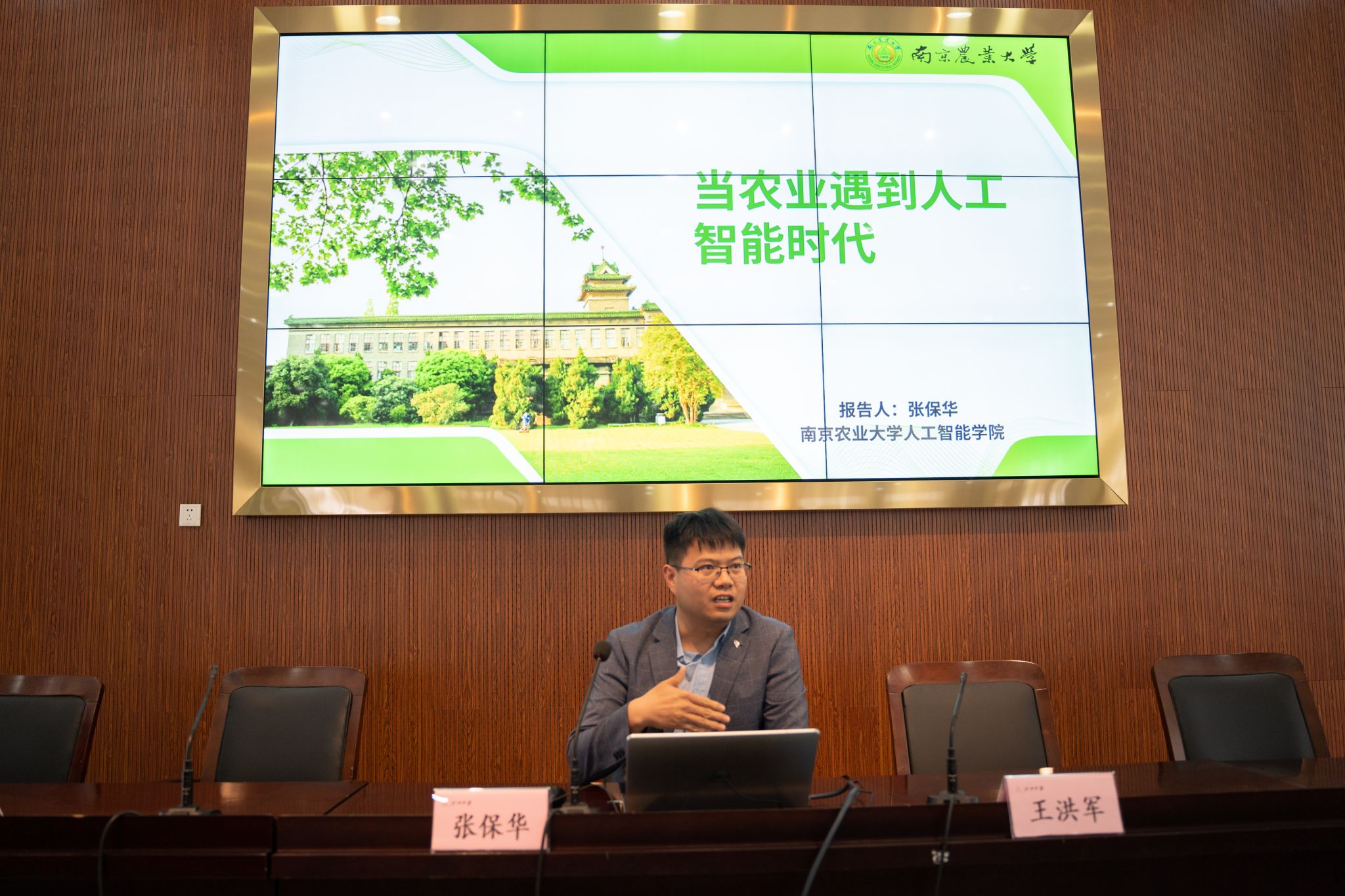 随后,张保华为沙洲中学的学生开展主题为《当农业遇到人工智能时代》的科普讲座,他介绍了人工智能、机器学习等前沿科技在农业机器人、智能农业装备等方面的交叉应用,生动阐述了农业与人工智能的融合发展。此外,他着重向同学们展示了南京农业大学在相关领域的研究成果,生动的视频及图片吸引了全场学生目光,开拓了学生视野,并引领同学们预见人工智能在乡村振兴战略实施推进过程中的广阔应用前景。在场同学均表示收获良多、受益匪浅。