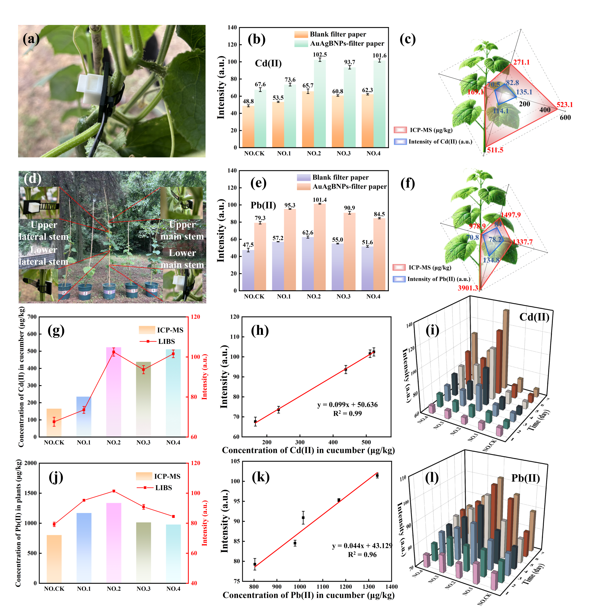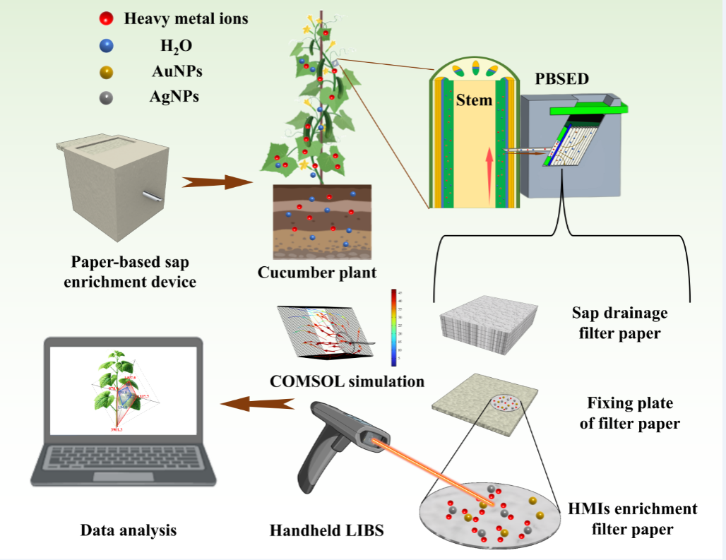 植物吸收镉和铅会抑制其光合作用、诱发氧化应激及DNA损伤,破坏植物生理功能,并通过食物链富集危害农业生态安全与人类健康。在这项工作中,赵国副教授团队提出了一种快速、高灵敏度、现场、微创的植物重金属检测方法。该方法将LIBS与植物汁液纸基富集装置相结合,显著提高了检测灵敏度,使其适用于快速可靠的现场连续检测。为了进一步改进检测方法,引入了可视化分析,研究了植物汁液中的重金属在滤纸上的空间分布。此外,采用COMSOL仿真模拟植物汁液在纸基微流控通道中的流动动力学,优化设计了纸基汁液富集装置。通过对黄瓜植株的实际测试,精确测得汁液中重金属镉和铅的含量,并探究了重金属在黄瓜植株体内的空间分布规律以及重金属对植株的胁迫效应,为作物胁迫机制解析与植株重金属现场检测提供了创新技术支撑。