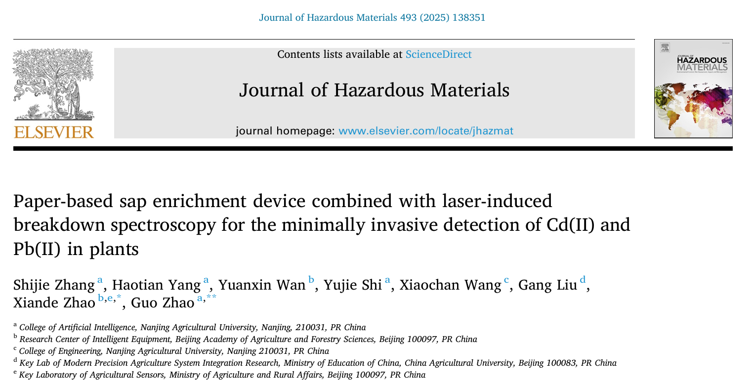 赵国副教授团队在环境领域著名期刊《Journal of Hazardous Materials》(IF=12.2,中科院1区Top)上发表了题为“Paper-based sap enrichment device combined with laser-induced breakdown spectroscopy for the minimally invasive detection of Cd(Ⅱ) and Pb(Ⅱ) in plants”的研究论文,报道了基于可穿戴纸基微流控和激光诱导击穿光谱(LIBS)的植物体内重金属微损检测技术的研究成果。