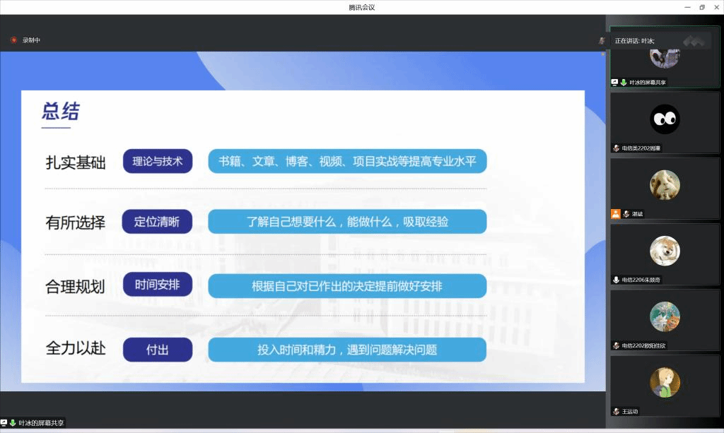 讲座伊始,叶冰从自身经历谈起,结合亲身事例,生动形象地阐述了人工智能方向未来就业的良好局势。随后,叶冰就薪资待遇、求职情况、人工智能行业情况、求职难易度、就业建议等诸多方面进行分享和介绍,让同学们对人工智能行业未来发展和就业情况有了更深层次的认识。接着,叶冰从大学阶段如何做准备、找工作的关键时间节点、简历的重要性、如何进入大厂等切实问题给出建议。他强调,大学期间在学好专业课的基础之上多接触一些竞赛,将会对未来发展起锦上添花的作用。最后,叶冰号召同学们在大学扎实基础、有所选择、合理规划、全力以赴,让大学不留遗憾。