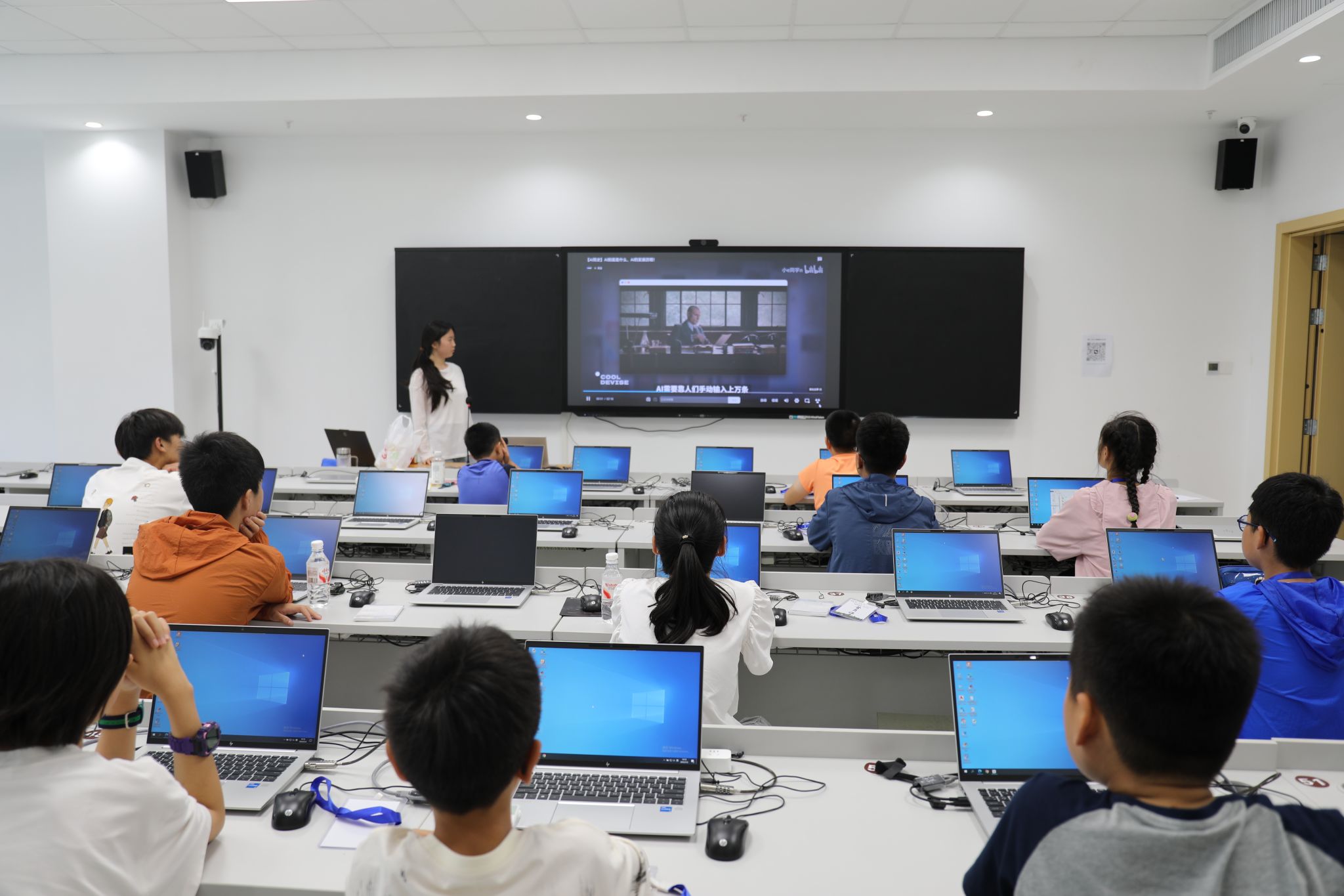 计算机实验中心平台,计算机系教师讲授理论部分,AI工坊“秾心启智·创想未来”七彩假期志愿服务团成员一对一指导孩子们进行实操。